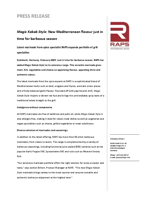 Latest marinade from spice specialist RAPS expands portfolio of grill specialities