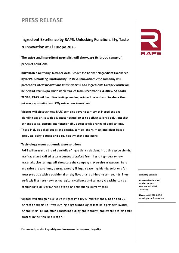 Ingredient Excellence by RAPS: Unlocking Functionality, Taste & Innovation at Fi Europe 2025