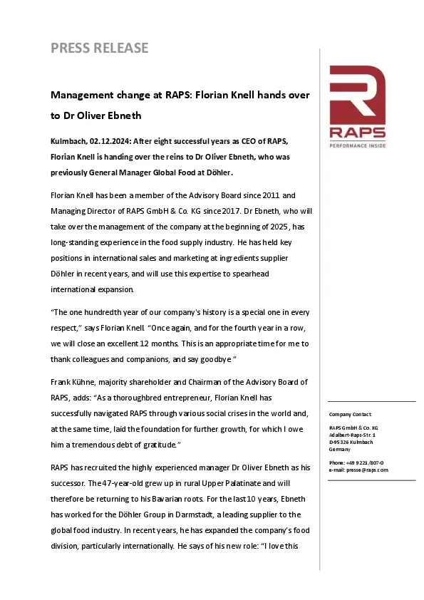 After eight successful years as CEO of RAPS, Florian Knell is handing over the reins to Dr Oliver Ebneth, who was previously General Manager Global Food at Döhler.