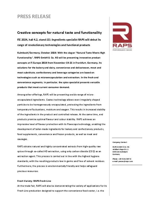 FiE 2024, hall 4.2, stand J21: Ingredient specialist RAPS will debut its range of revolutionary technologies and functional products
