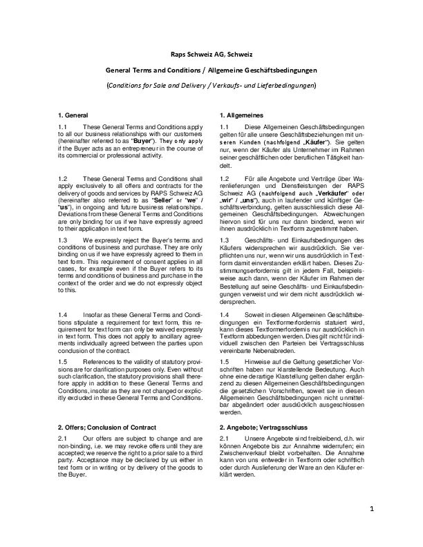 1.2 These General Terms and Conditions shall apply exclusively to all offers and contracts for the delivery of goods and services by RAPS Schweiz AG (hereinafter also referred to as “Seller” or “we” / “us”), in ongoing and future business relationships. Deviations from these General Terms and Conditions are only binding for us if we have expressly agreed to their application in text form.