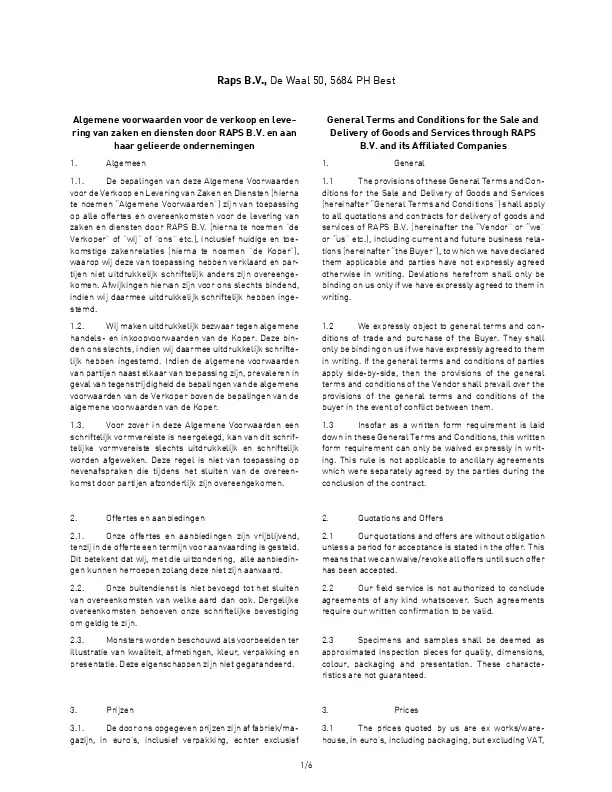 1.1. De bepalingen van deze Algemene Voorwaarden voor de Verkoop en Levering van Zaken en Diensten (hierna te noemen “Algemene Voorwaarden”) zijn van toepassing op alle offertes en overeenkomsten voor de levering van zaken en diensten door RAPS B.V. (hierna te noemen "de Verkoper" of "wij" of "ons" etc.), inclusief huidige en toekomstige zakenrelaties (hierna te noemen "de Koper"), waarop wij deze van toepassing hebben verklaard en partijen niet uitdrukkelijk schriftelijk anders zijn overeengekomen. Afwijkingen hiervan zijn voor ons slechts bindend, indien wij daarmee uitdrukkelijk schriftelijk hebben ingestemd.