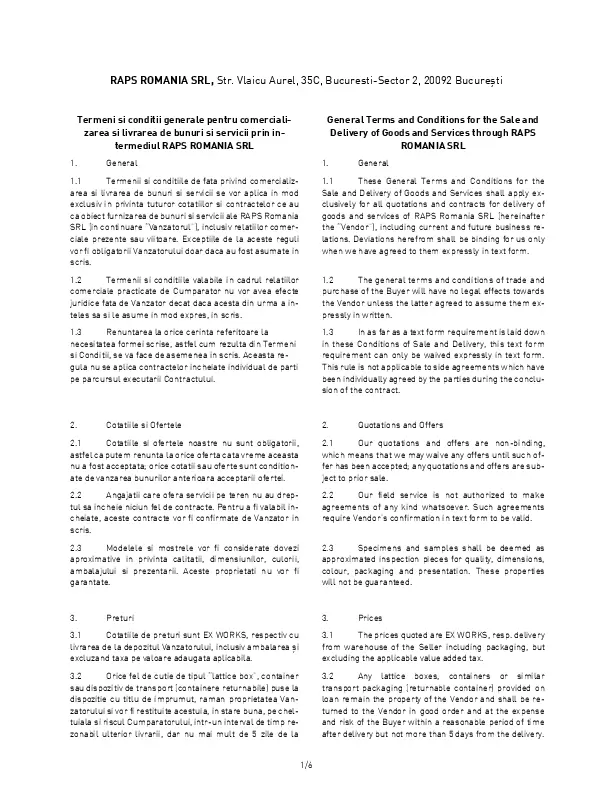 1.1 Termenii si conditiile de fata privind comercializarea si livrarea de bunuri si servicii se vor aplica in mod exclusiv in privinta tuturor cotatiilor si contractelor ce au ca obiect furnizarea de bunuri si servicii ale RAPS Romania SRL (in continuare “Vanzatorul”), inclusiv relatiilor comerciale prezente sau viitoare. Exceptiile de la aceste reguli vor fi obligatorii Vanzatorului doar daca au fost asumate in scris.