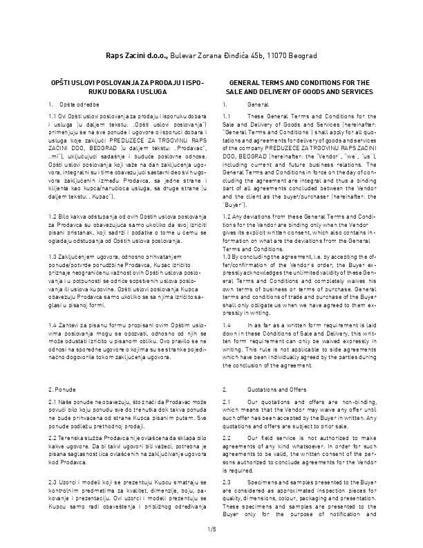 1.1 Ovi Opšti uslovi poslovanja za prodaju i isporuku dobara i usluga (u daljem tekstu: „Opšti uslovi poslovanja“) primenjuju se na sve ponude i ugovore o isporuci dobara i usluga koje zaključi PREDUZEĆE ZA TRGOVINU RAPS ZAČINI DOO, BEOGRAD (u daljem tekstu: „Prodavac“, „mi“), uključujući sadašnje i buduće poslovne odnose. Opšti uslovi poslovanja koji važe na dan zaključenja ugovora, integralni su i time obavezujući sastavni deo svih ugovora zaključenih između Prodavca, sa jedne strane i klijenta kao kupca/naručioca usluga, sa druge strane (u daljem tekstu: „Kupac“).