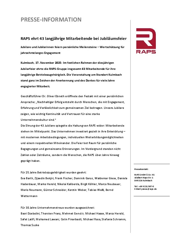 RAPS ehrt 43 langjährige Mitarbeitende bei Jubiläumsfeier